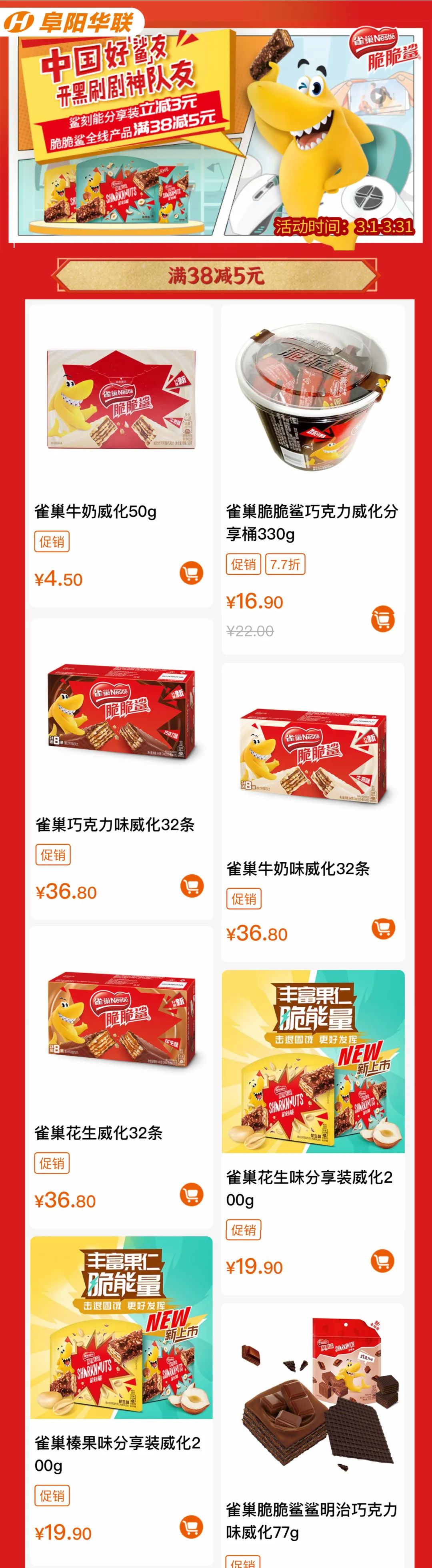 阜陽(yáng)華聯(lián)優(yōu)選 | 雀巢脆脆鯊全線(xiàn)產(chǎn)品滿(mǎn)38立減5